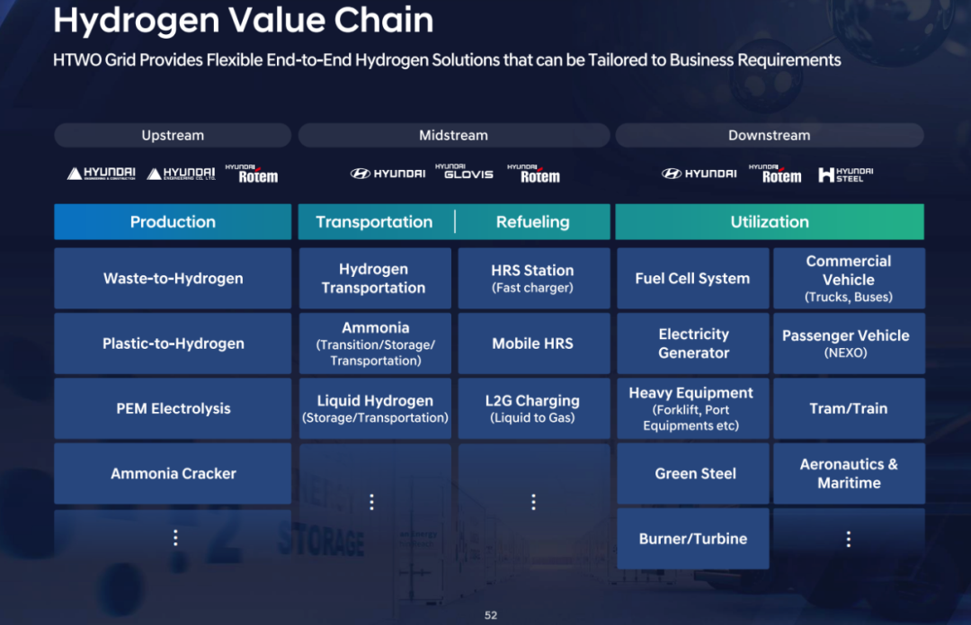 Beyond batteries, Hyundai has a comprehensive hydrogen energy strategy, encompassing production, transportation, refueling, and end-use across the entire supply chain.