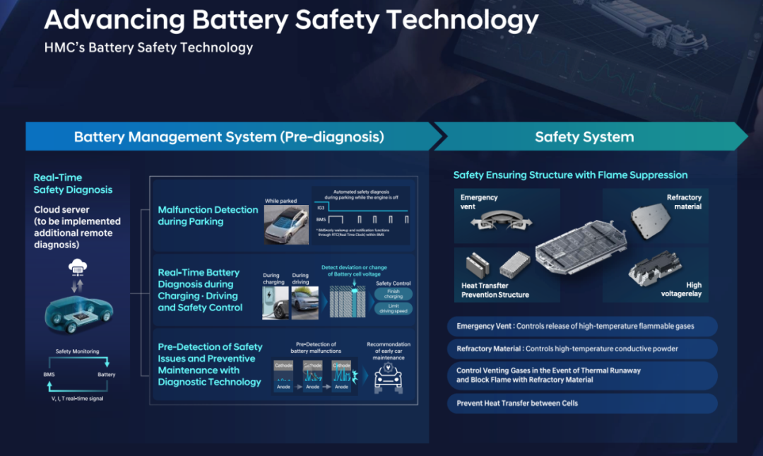 - Proactive battery management system for real-time cloud-based monitoring and diagnosis during parking and charging to ensure safety. - System safety design includes safety vents for thermal runaway, fire-resistant materials to control thermal conduction, thermal conduction impedance structures, and high-voltage relays to prevent thermal propagation in case of battery issues.