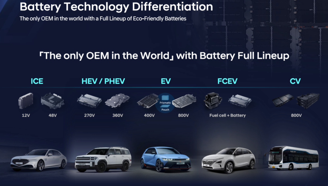 Battery technology remains crucial due to its high value in the electrification process. Hyundai employs differentiated battery technologies tailored to its diverse range of powertrain options: