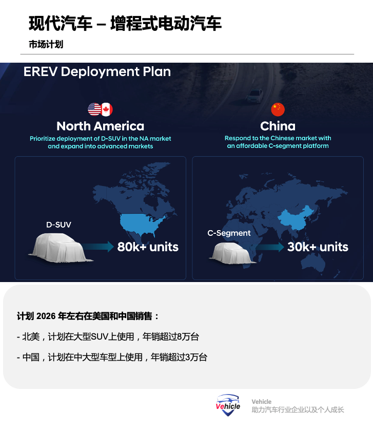 Hyundai plans to launch its EREVs in the US and China around 2026: in North America, for large SUVs with annual sales exceeding 80,000 units; and in China, for mid-to-large vehicles with annual sales expected to surpass 30,000 units, focusing on the US and Chinese markets.