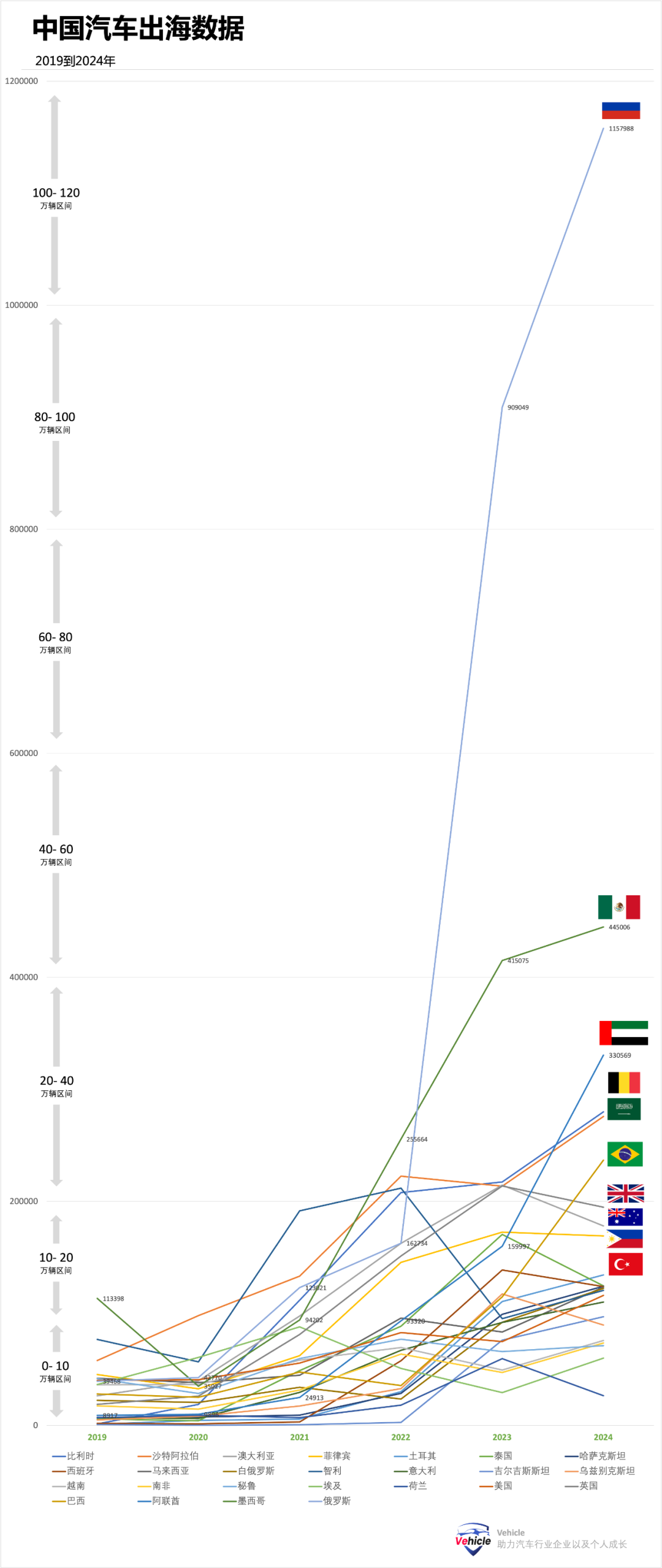 In 2024, China exported 1,157,988 vehicles to Russia, vastly outpacing other countries. This figure stood at only 39,468 vehicles in 2019, marking a nearly 30-fold increase over five years.