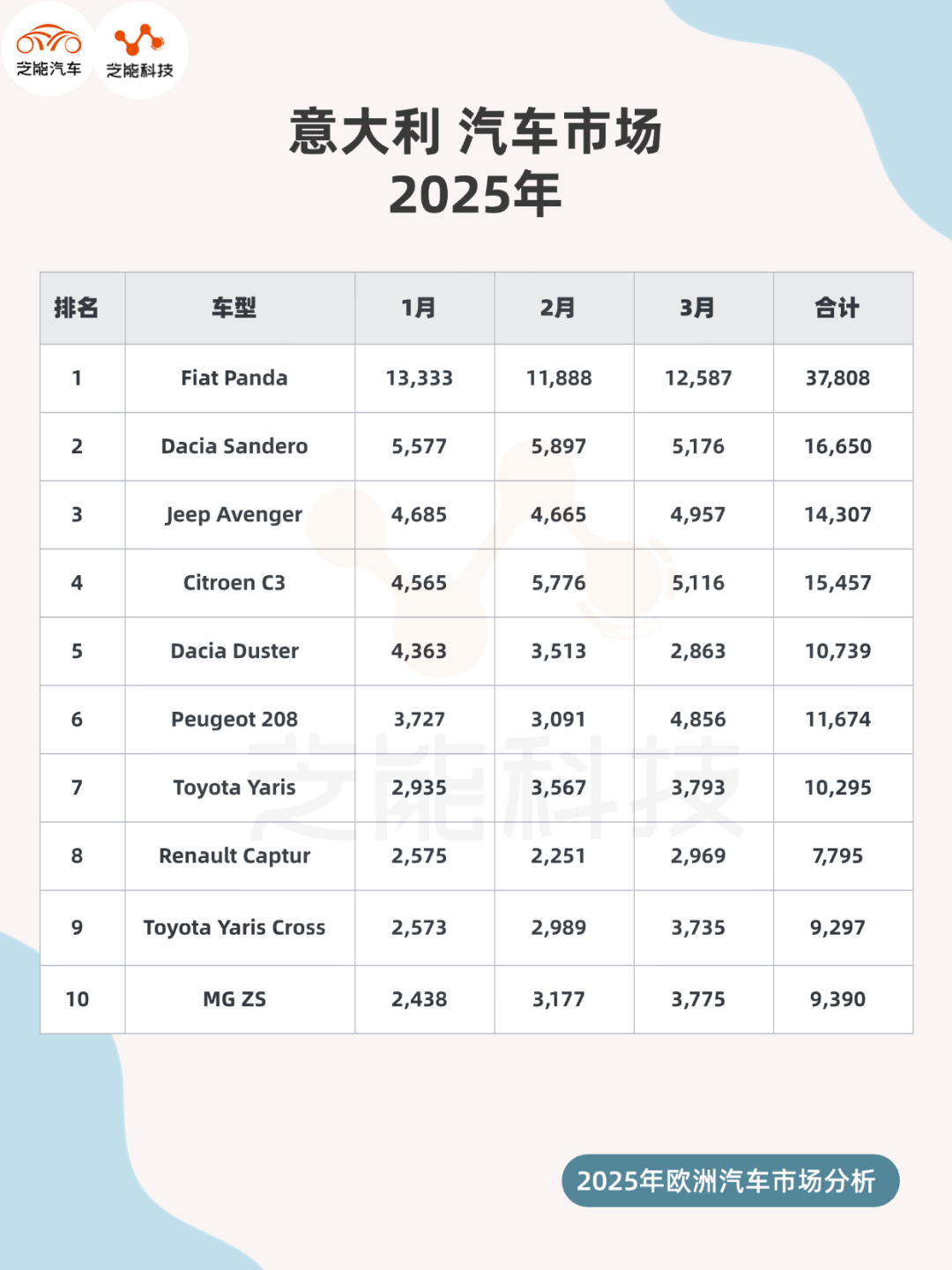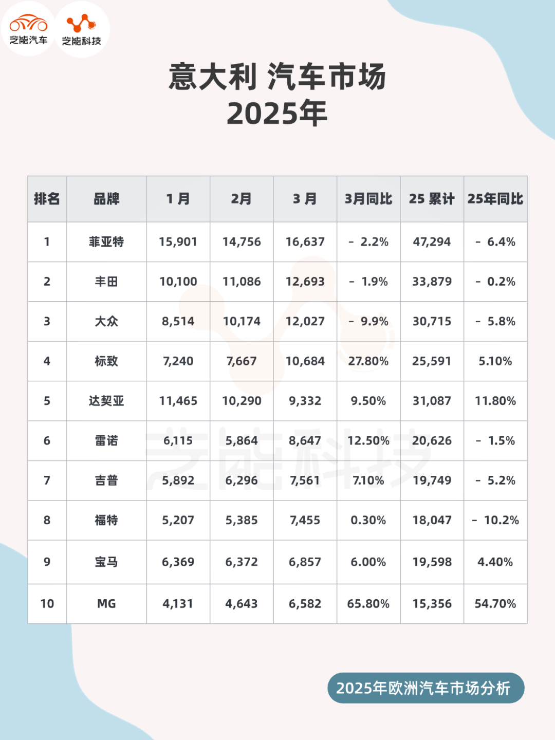 In March 2025, the Italian auto market achieved a 6.2% growth, primarily driven by new energy vehicles. The standout performances of Chinese brands MG and BYD were the highlights of the month, with MG breaking into the top 10 for the first time and BYD experiencing a staggering 2452.9% surge in sales. These achievements underscore the success of Chinese automakers in technological innovation and market strategy.