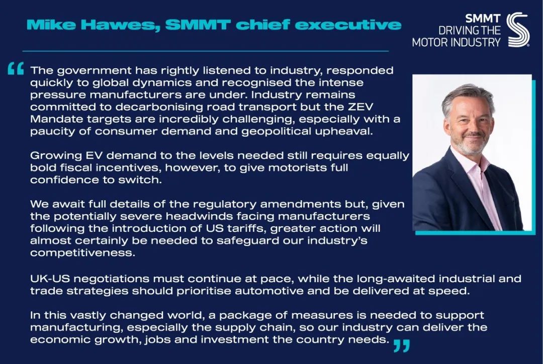 Mike Hawes, CEO of SMMT, said, 'The automotive industry is already facing multiple headwinds, and this announcement comes at the right time. SMMT has been in contact with the government and will seek to accelerate trade negotiations, as we need to find a way forward that supports employment and economic growth on both sides of the Atlantic.'