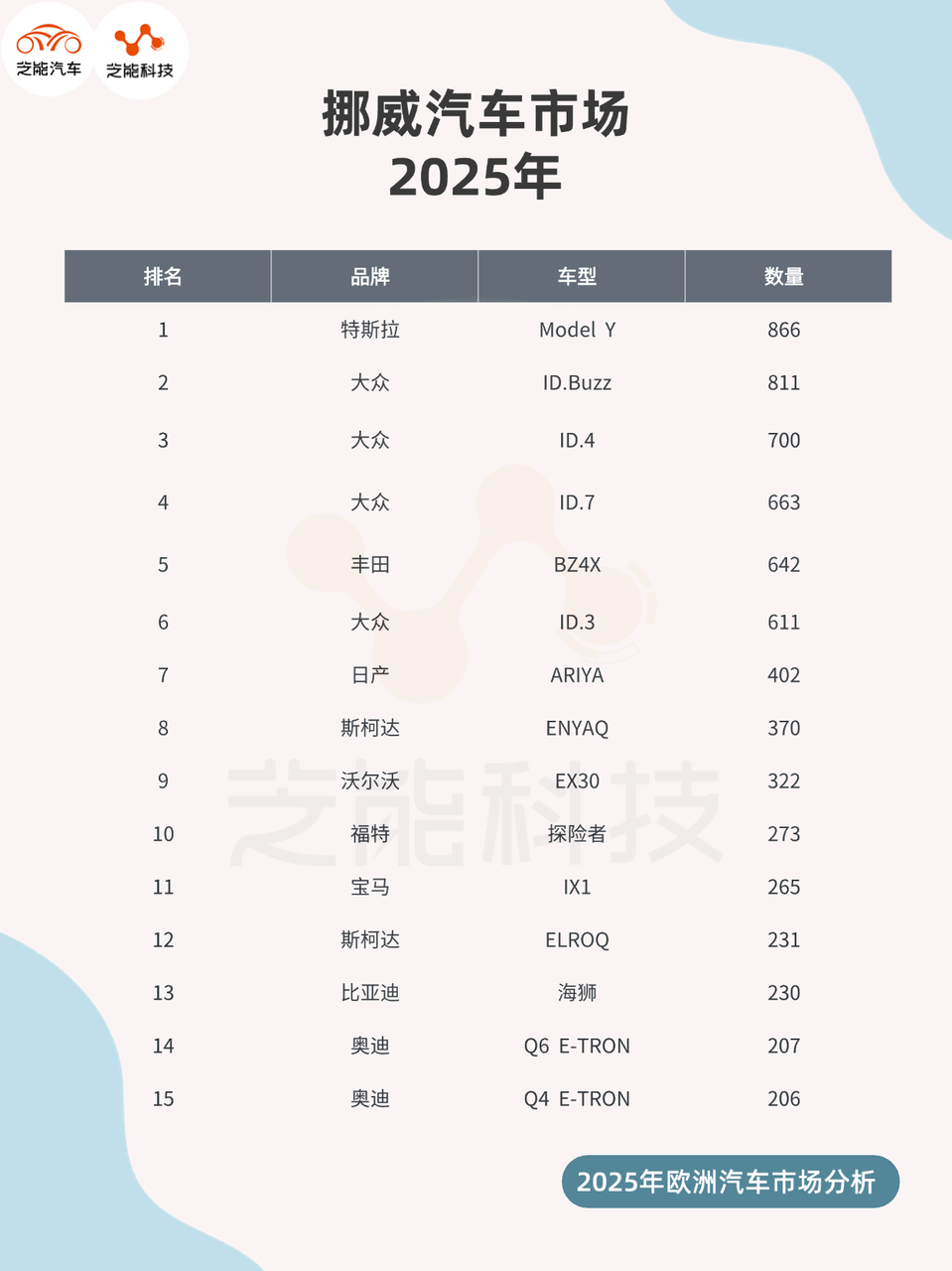 ◎ Among subsequent Japanese and Nordic brands, Nissan Ariya (423 units), Skoda Enyaq (356 units), Volvo EX30 (343 units), BMW iX1 (293 units), and Ford Explorer (291 units) are primarily mid-size to compact SUVs, further highlighting that the current mainstream demand in the Norwegian market revolves around electric SUV products.