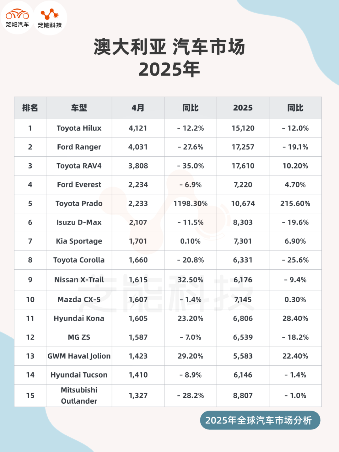 MG, which had long been in the top 10 in Australia, sold 3,103 units in April, down 17.9% year-on-year. This is the first time MG has fallen out of the top 10 since June 2024, indicating challenges in transitioning between old and new models and weakening price attractiveness. In contrast, Chery and BYD have quickly risen to prominence with new products and new energy momentum.