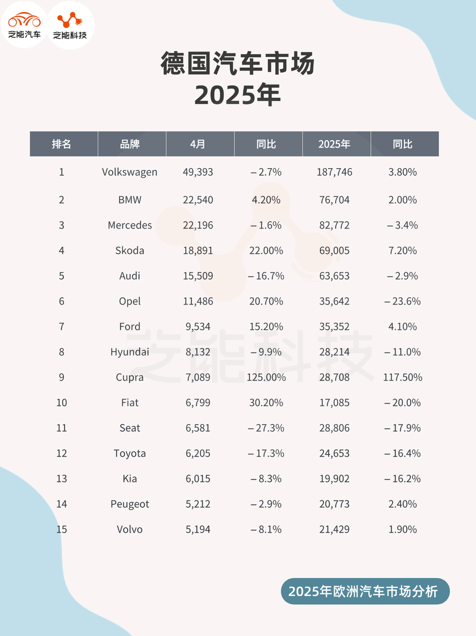 In April 2025, the German new car market exhibited overall stability, yet the competitive dynamics within the electrification sector subtly shifted. For the first time, BYD outpaced Tesla in monthly sales, signaling a pivotal stage in the penetration of Chinese brands into mainstream European markets.