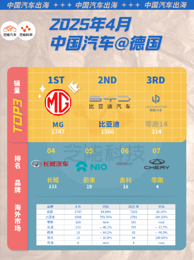 Additionally, MG and Roewe under SAIC Group maintained stable performance in Germany. Combined sales of MG and Roewe in April totaled 1,747 units, up 34% year-on-year, ranking 25th, slightly ahead of BYD.