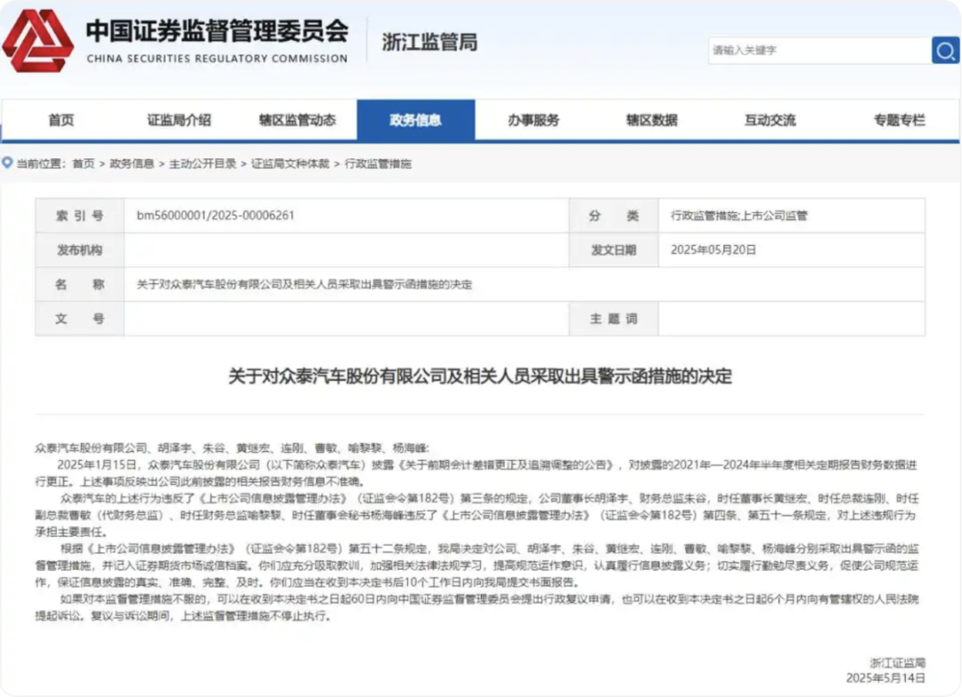 Recently, Zotye Auto found itself in the spotlight following a warning letter from the Zhejiang Regulatory Bureau of the China Securities Regulatory Commission (CSRC).
