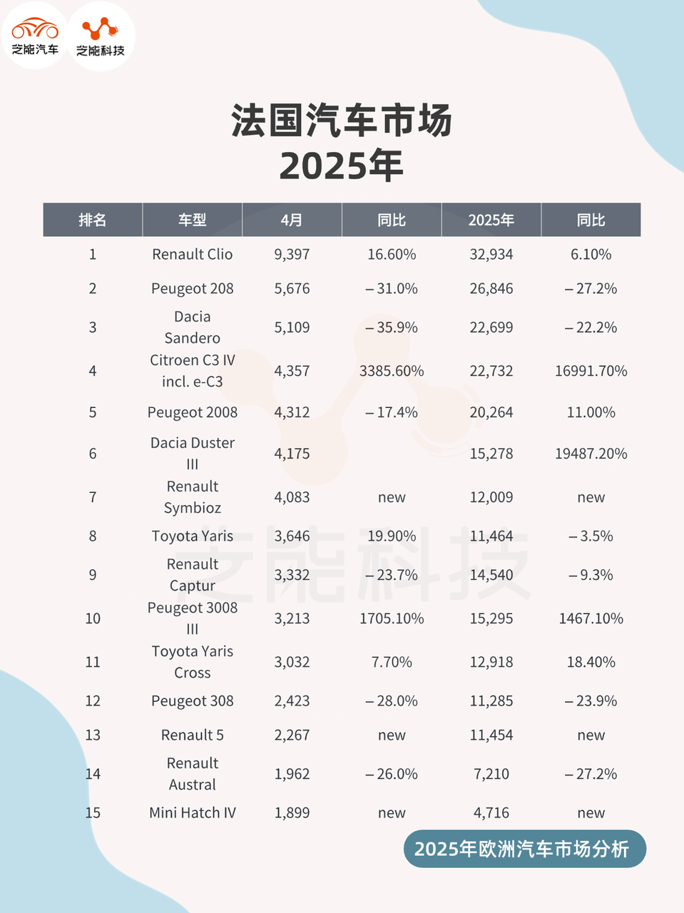 Traditional German and French brands such as Peugeot (-10.7%), Volkswagen (-15.4%), and BMW (-12.8%) generally experienced declines, particularly with sales of Peugeot 208 (-31.0%) and Dacia Sandero (-35.9%) plummeting, leading to a drop in their overall rankings.