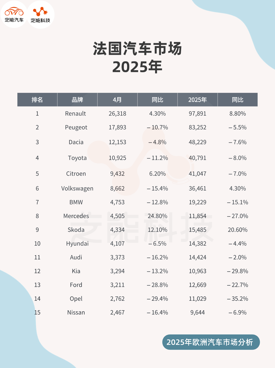 In April 2025, the French new car market continued to experience sluggishness, registering a year-on-year decline of 5.6%. Amidst this downturn, gasoline and diesel models suffered significant losses, whereas hybrid vehicles emerged as a growth highlight.