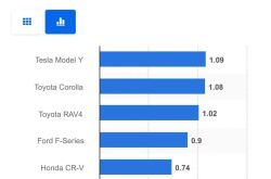 • Tesla Model Y Narrowly Overtakes Toyota Corolla in Sales