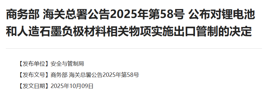 On October 9, China's Ministry of Commerce and General Administration of Customs jointly issued Announcement No. 58, imposing export controls on lithium batteries, cathode materials, graphite anode materials, and related manufacturing equipment. This marks China's first explicit inclusion of lithium-battery manufacturing equipment in export control regulations. Set to take effect on November 8, the policy spans the entire industrial chain, from key materials to core equipment.