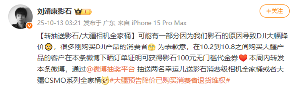 However, in a more absurd twist, Insta360's CEO suddenly announced 'an apology on behalf of DJI,' stating that consumers who purchased DJI products between October 2nd and October 8th could receive a 100 yuan no-threshold voucher from Insta360 by sharing their order proof on Weibo. Additionally, they announced that two lucky users would be drawn by retweeting the post, with prizes including a valuable 'full-set' grand prize—either a complete set of Insta360 consumer cameras or a full set of DJI OSMO series products, with winners choosing whichever they prefer.