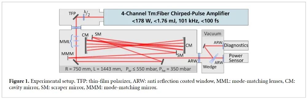 Figure 1: Experimental Setup [1] Figure 1 presents the experimental setup. At the front end, there is a four-way coherent synthesis Tm-doped fiber system. This system can deliver pulses with an average power of 178 W, a pulse energy of 1.76 mJ, and a repetition rate of 101 kHz, centered at a wavelength of 1930 nm, with a pulse duration of 80 fs. Before entering the MPC cavity, the beam undergoes mode matching through a lens assembly. The cavity mirrors have a radius of curvature of 750 mm and are spaced 1443 mm apart. The Group Delay Dispersion (GDD) of these cavity mirrors is less than 25 fs² within the wavelength range of 1675 - 2125 nm. The beam has a focal diameter of 0.59 mm, and the spot diameter at the cavity mirrors is 3.03 mm. Given the narrow input pulse width, only 15 passes through the MPC are required to achieve sufficient spectral broadening. The MPC device is housed in a vacuum-sealed container, and experiments are conducted at pressures below 1 bar. Krypton (Kr) is used as the nonlinear gas within the cavity at a pressure of ≤550 mbar. Additionally, 350 mbar of Helium (He) is introduced to enhance heat dissipation and prevent potential thermal drift. The beam is collimated using a mirror with a radius of curvature of 4500 mm and exits the system through a 5 mm fused silica window. A small portion of the beam is reflected by a wedge-shaped fused silica plate for detection purposes. The sampled beam passes through a 1 mm-thick fused silica plate before entering the detector, while the power of the transmitted beam is measured through a 5 mm-thick fused silica plate. The compressor in the system consists of fused silica and provides -518 fs² of second-order dispersion before the sampled beam reaches the detector, having passed through a total of 6 mm of fused silica.