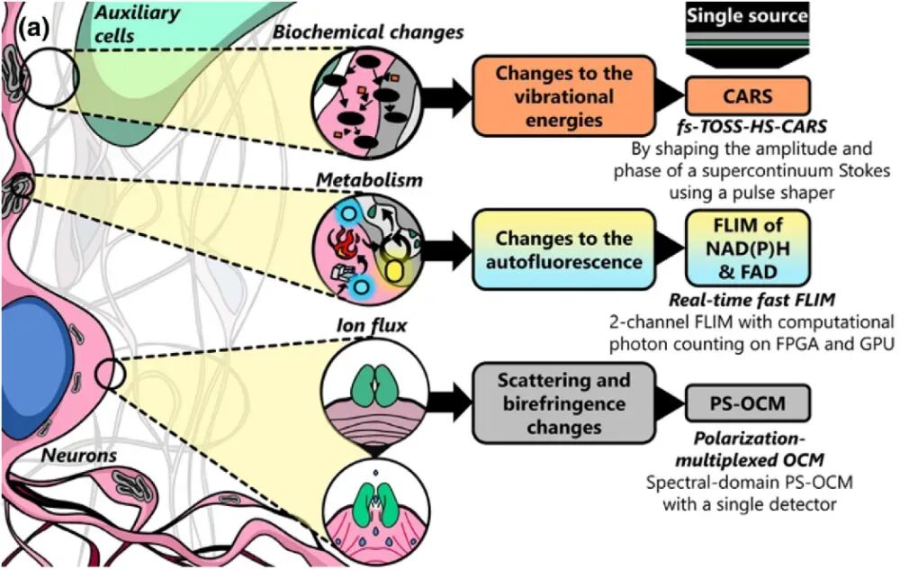 Figure 1. Various physical, metabolic, and biochemical changes occurring in the neuronal microenvironment [1]. The team led by Stephen Boppart at the University of Illinois at Urbana-Champaign has put forward a novel multimodal optical microscopy system named VAMPIRE, an acronym for “Versatile Autofluorescence lifetime, Multiharmonic generation, Polarization-sensitive Interferometry, and Raman imaging in epi-detection”. This system is capable of simultaneously acquiring four distinct physical and chemical signals: Scattered light: It detects changes in the cellular refractive index, which are correlated with electrical activity. Birefringence: It characterizes orientation changes in cell membranes or fibrous structures. Autofluorescence: It originates from metabolic cofactors NAD(P)H and FAD, enabling the assessment of cellular energy status. Raman scattering: It provides molecular vibration information, facilitating the analysis of the local biochemical environment. All these signals are excited by the same laser source. Through precise optical path design and computational imaging techniques, synchronous, high-speed, and high-resolution imaging is achieved.