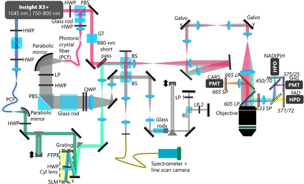 Figure 2. Schematic diagram of the VAMPIRE microscope system [1]. To achieve the simultaneous acquisition of the aforementioned multiple signals, the VAMPIRE system integrates various imaging modalities, including Optical Coherence Microscopy (OCM), Multiharmonic Imaging, Polarization-Sensitive Interferometry, Fluorescence Lifetime Imaging Microscopy (FLIM), and Coherent Anti-Stokes Raman Scattering (CARS) Imaging. The system employs a titanium-sapphire laser as the excitation source and combines it with a photonic crystal fiber to generate a supercontinuum spectrum. A Fourier transform pulse shaper is utilized to control the Stokes light in both the frequency and time domains, enabling the synchronous acquisition and processing of multimodal signals. Figure 2 illustrates the system structure of the VAMPIRE microscope. The gray optical path represents the Optical Coherence Microscopy module. Based on low-coherence interference principles, this module reconstructs the microscopic structure of samples by detecting interference signals between scattered light returned from different depths of the sample. To achieve high-resolution imaging, the system requires a light source with a relatively broad bandwidth. In this system, a titanium-sapphire laser with a central wavelength of 770 nm and a repetition rate of 80 MHz serves as the excitation source. Part of the output laser is coupled into a photonic crystal fiber to generate a supercontinuum spectrum with a bandwidth of approximately 200 nm. Subsequently, a series of optical components, including polarization beam splitters and dichroic mirrors, split and combine the beam, ultimately directing it into a linear scanning device. In the CARS imaging modality, the green optical path represents the Stokes light, while the pink optical path represents the pump light. Injecting a 1.3 W, 1045 nm laser into the photonic crystal fiber generates a supercontinuum spectrum spanning 200 nm (base width). The system employs a custom-designed Fourier transform pulse shaper, which consists of a diffraction grating and a spatial light modulator. This shaper independently controls the amplitude and phase of the Stokes light at different wavelengths, ensuring spectral resolution while maintaining femtosecond pulse width. This technique is known as TOSS-CARS [2]. After shaping, the Stokes light is tuned to cover several specific vibrational frequencies (e.g., 2830 cm⁻¹, 2930 cm⁻¹), interacting with the pump light to achieve specific imaging of different biochemical components, such as the CH stretching vibration region. Additionally, another 770 nm femtosecond laser in the system excites the autofluorescence of FAD and NAD(P)H and generates second harmonic signals. Signals from various imaging modalities are collected through a precisely configured filter system, which effectively separates signals from different imaging channels and minimizes spectral overlap, demonstrating the rationality of the system's optical path design.