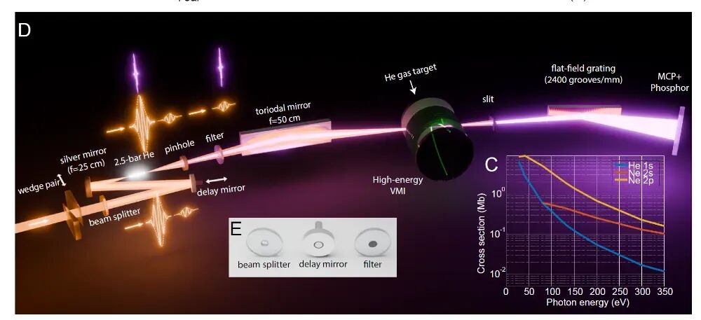 The system is illustrated in Figure 2. It utilizes a ytterbium-doped femtosecond laser device with a central wavelength of 1030 nm. After compression, this device generates driving pulses of 3.7 fs and 1 mJ. The beam is then split by a beam splitter into an outer strong pulse (for HHG) and an inner weak pulse (for characterization). The inner pulse is precisely adjusted using an electrically controlled delay mirror. Subsequently, it is co-focused with the outer pulse by a silver mirror into a helium gas cell to generate attosecond pulses. Afterward, a pinhole filters out residual infrared light, allowing only XUV and central infrared light to pass through. A fused silica filter with a central aperture is then employed to compensate for the delay of the inner pulse. Meanwhile, replaceable metal thin-film filters truncate low-energy XUV components and compensate for attosecond chirp. Finally, the two beams are focused by a parabolic mirror into the detection area for synchronized measurement.