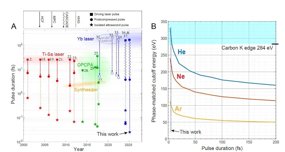 The attosecond pulse, which lasts for 10-18 seconds, stands as the shortest time-scale tool mastered by humankind. It enables the direct observation and control of ultrafast electron dynamics within atoms. Since the year 2000, the development of attosecond pulses has progressed through three distinct stages (as shown in Figure 1). During the first decade, titanium-sapphire femtosecond lasers, with a central wavelength of 800 nm, were predominantly employed. These lasers generated 4–5 fs driving pulses through hollow-core fiber compression. Subsequently, high-order harmonic generation (HHG) was utilized to produce isolated attosecond pulses. However, constrained by the driving spectrum and phase-matching conditions, these pulses typically exhibited photon energies below 150 eV and pulse widths around 60 as. To further shorten the pulse width, it became necessary to expand the coverage of the harmonic spectrum.