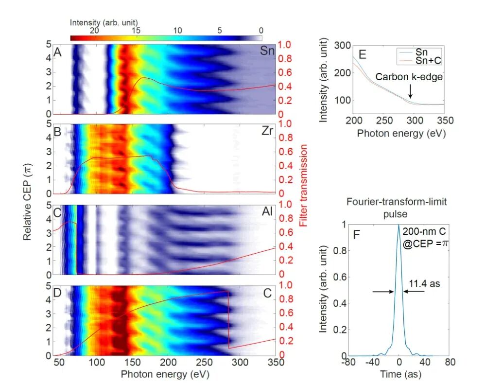 During the experiment, the rising edge of the carbon film's transmission spectrum provided negative group delay dispersion (GDD), with each 200 nm of thickness contributing -400 as2 GDD. By systematically adjusting the carbon film thickness (ranging from 200–600 nm), changes in the symmetry of photoelectron streaks were observed to control the chirp (as shown in Figure 4). Without a filter, the streaks were tilted, indicating positive chirp. As the thickness increased, the streaks became more symmetric, approaching complete symmetry at 500 nm. This reflected effective compensation of attosecond chirp and a pulse close to the transform limit. When the thickness increased to 600 nm, the streaks tilted in the opposite direction, indicating negative chirp introduced by over-compensation. Ultimately, by optimizing the thickness, the pulse was successfully compressed to 25 as.