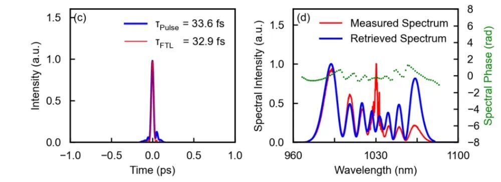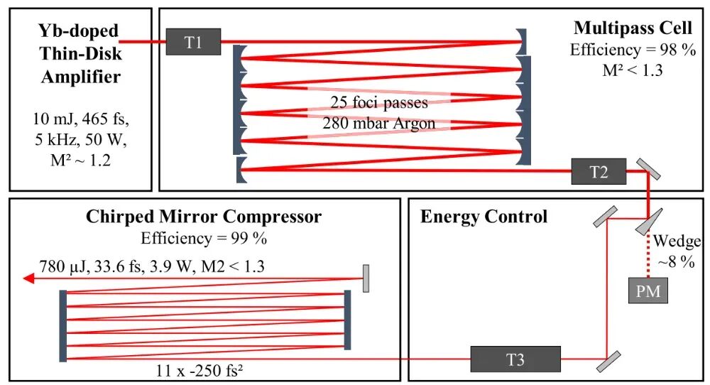 Figure 1 shows the experimental setup of the gas multi-pass cell [1]. Following dispersion compensation, the pulse width is successfully compressed to 33.6 fs (with a transform-limited pulse width of 32.9 fs), and the transmission efficiency reaches as high as 98% (as illustrated in Figure 2).