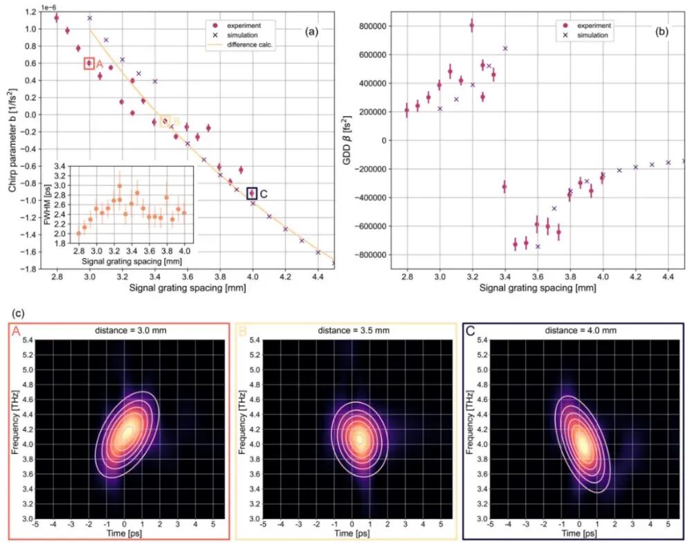 Figure 4(a) illustrates the variation of the fitted idler wave chirp parameter b with signal light grating spacing, where solid circles represent experimental measurements and crosses denote simulation results. The inset displays the full width at half maximum (FWHM) of the electric field waveform, with the yellow solid line indicating the theoretically calculated chirp curve. Figure 4(b) shows the variation of group delay dispersion β with grating spacing, while Figure 4(c) presents two-dimensional time-frequency diagrams (contours as fitted results) for three selected spacings.