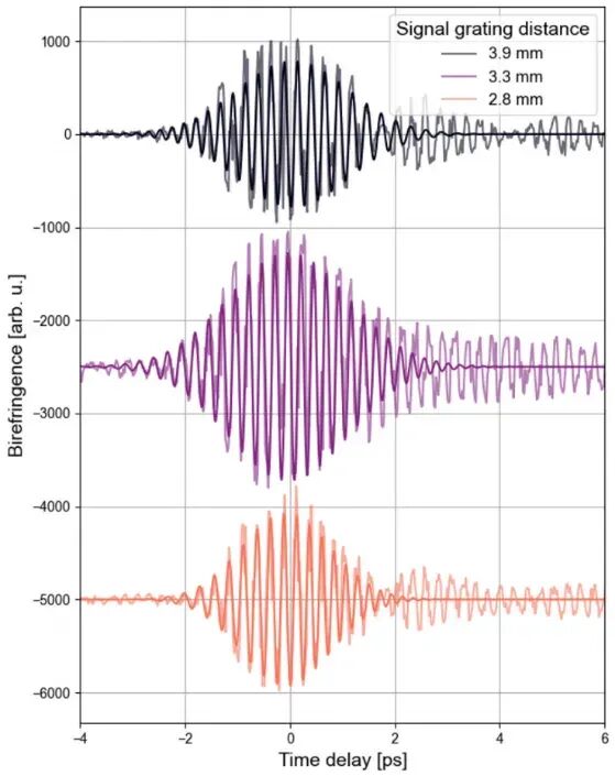 Figure 3 displays the measured electric field waveforms of the idler wave under different signal light grating spacings. Within approximately ±2 ps, the experimental data closely match the fitted results; however, deviations occur after t > 2 ps. Discrepancies in the 4-5 ps interval may be attributed to reflections of terahertz pulses within the generation or detection crystal, while deviations in the 2-4 ps interval may arise from narrowband absorption by residual water vapor in the optical path.