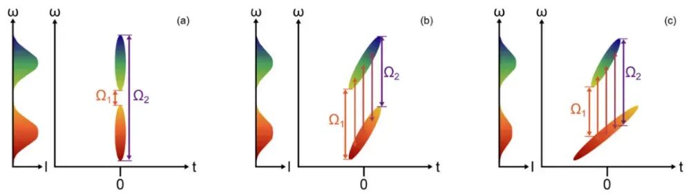 Figure 1. Time-frequency representation of difference-frequency pulses generated by infrared pulses with varying chirp values[1]