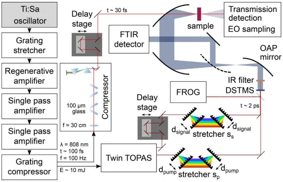 The experimental setup is illustrated in Figure 2. The front-end light source is a high-power titanium sapphire laser system, which emits 100 fs pulses with a central wavelength of 808 nm, a single-pulse energy of 20 mJ, and a repetition rate of 100 Hz. The output beam is divided into two paths: one path is used for generating mid-infrared pulses, while the other is employed for electro-optic sampling to detect their waveform. In the mid-infrared generation path, a pair of commercial optical parametric amplifiers generate pulses with tunable central wavelengths ranging from 1300 to 1550 nm. Here, the higher-frequency pulse serves as the pump light, and the lower-frequency pulse as the signal light. Both the pump and signal lights pass through transmissive grating stretchers, and their chirp levels are controlled by adjusting the positions of the two intermediate gratings. After beam expansion, the two beams are directed onto a 330 µm-thick DSTMS crystal. In the experiment, the signal light frequency is set to 210 THz (1426 nm, 80 µJ), and the pump light frequency to 214 THz (1400 nm, 480 µJ), resulting in the generation of a 4 THz mid-infrared idler wave with an energy of 1.8 µJ. In the mid-infrared pulse characterization path, a 30 µJ pulse split from the main path is compressed to 30 fs using a thin glass plate and prism pair. Part of the compressed pulse is focused onto a 200 µm-thick GaP crystal, overlapping spatially and temporally with the mid-infrared pulse for subsequent electro-optic sampling.