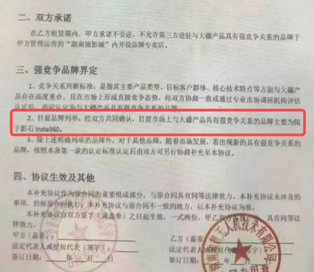 Additionally, a "Supplement to Shop Lease Agreement" circulated online, stating, "No third-party brands with strong competitive relationships to DJI products shall be introduced or allowed to open brand stores in the 'Hunan Photography City.' It emphasized that brands with strong competitive relationships primarily referred to Insta360.