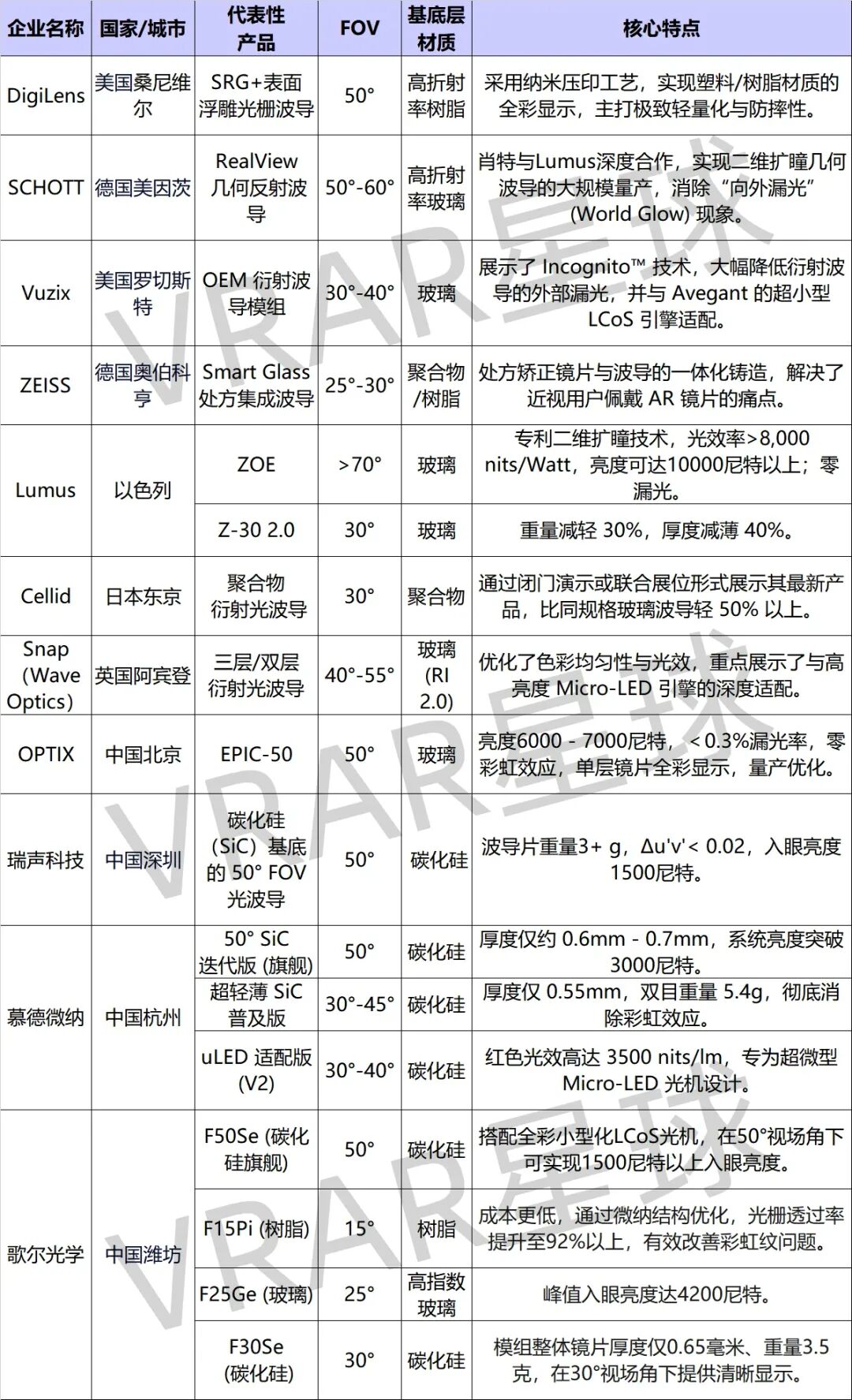 So, what technological trends in optical waveguide development can we discern at this premier international optics event, SPIE? Let's first take stock of the vendors who participated this year, the technologies they brought, and the highlights they presented. Refer to the table below (the most comprehensive online, a must-have for enthusiasts):