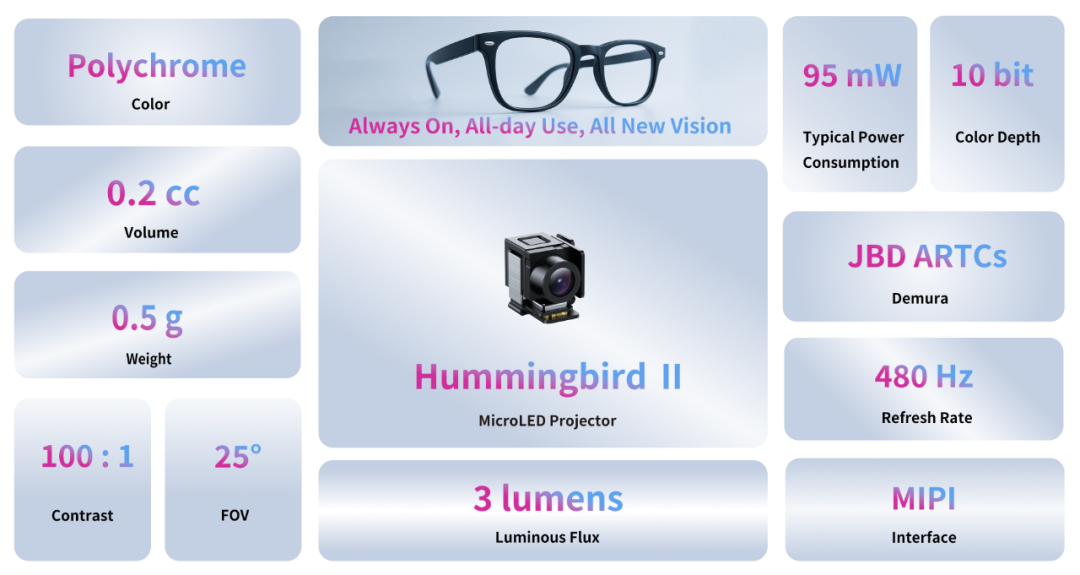 JBD: Launched the 0.2cc Hummingbird II color light engine in September, based on a 0.1-inch tricolor X-Cube combination scheme. Weighing just 0.5g and 50% smaller than its predecessor, it became the smallest mass-produced color light engine. Its mechanical length was also reduced from 11.99mm to 8.57mm, greatly enhancing design flexibility for temple structures.