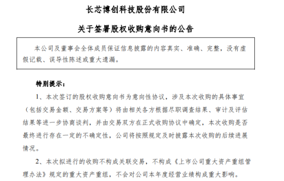 Changxin Bochuang revealed that on February 24, 2026, it inked an 'Equity Acquisition Letter of Intent concerning Shanghai Honghui Optical Link Communication Technology Co., Ltd.' with Shanghai Honghui Optical Communication Technology Co., Ltd. (hereinafter referred to as 'Honghui Optical Communication'). This agreement pertains to the 93.8108% stake held by Honghui Optical Communication in Shanghai Honghui Optical Link Communication Technology Co., Ltd. (hereinafter referred to as 'Honghui Optical Link'), marking a preliminary agreement for acquisition. The tentative transaction value stands at approximately RMB 375 million, with subsequent plans to coordinate the acquisition of the remaining shares to attain 100% ownership of Honghui Optical Link.