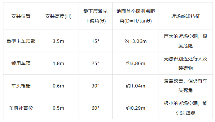 If the LiDAR is installed at the center of the roof and the downward deviation angle of its lowest scanning line is insufficient, a ground blind zone with a radius of several meters will appear around the vehicle. Within this area, any object with a height lower than the laser beam path cannot generate a reflected signal.