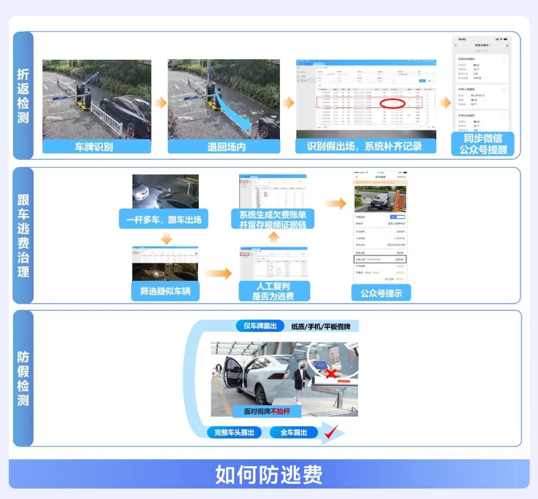 Toll evasion tactics such as fake exits and tailgating to avoid fees represent hidden losses for parking lots. Hikvision's parking system leverages abnormal capture and billing traceability, vehicle movement recognition systems, etc., to flexibly apply features like turn-back detection and anti-fake detection from entrance capture products to toll collection scenarios. This blocks toll evasion loopholes at their source, helping clients reduce financial losses and achieve orderly operations.